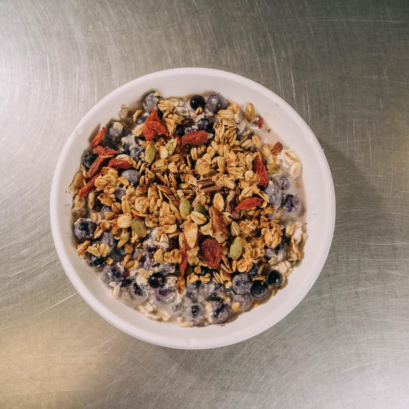 Gluten-Free Oats, Choice of Milk, Blueberries, house-made Granola (contains nuts, no sugar), Goji Berries, Flax, Cinnamon