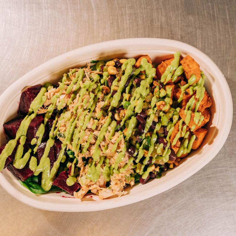 Roasted Sweet Potatoes, Roasted Beets, house-made Tomatillo Salsa with Corn and Black Beans, on a bed of Quinoa and Organic Greens, topped with house-made Vegan Goddess Drizzle